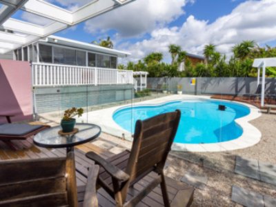 DescriptionBring the family along to this spacious home overlooking the beautiful inground pool and entertainment area. Spread out in the 4 bedroom home or enjoy the privacy of the modern and relaxed guest house also overlooking the pool. Take advantage of the short walk down to the waterfront in this quiet area of Bribie Island but only a short drive to all that there is to offer. * 4 bedrooms all with linen * 2 bathrooms main with bath * Open plan studio with bed, kitchen and bathroom * Air-conditioning throughout * In-ground pool * BBQ area * Large kitchen with dishwasher and microwave * Laundry with washing machine and dryer * Short walk to the waterfront * Fully fenced yard * External CCTV * Please note a non-refundable fee of $48 is payable per dog - outside only The information contained within the property description and photographs is subject to change.